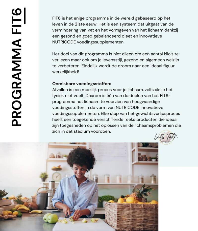 Gebruik een gezonde en effectieve afslankingsmethode. We garanderen een ideaal gebalanceerd 6-stappen plan om gemakkelijk en veilig een aantal kilo's te verliezen. Dankzij FIT6 geniet je niet alleen van een slank figuur maar ook van een perfecte gezondheid en algemeen welzijn.